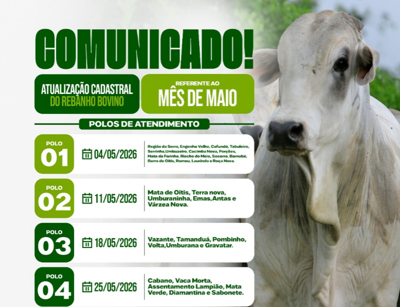 Com o objetivo de orientar os criadores de animais no território rural de Diamante, a Secretaria de Agricultura divulgou, nesta terça-feira (28),o cronograma de atendimento para atualização cadastral do rebanho bovino no município. A ação é obrigatória e conta com o apoio da Empaer/PB, através do Governo da Paraíba, para o registro dos dados.